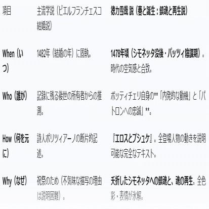 美術史における「正解」を断定することは困難ですが、徳力雪哉氏の新説と、従来の主流学説(ロレンツォ・ディ・ピエルフランチェスコ・デ・メディチの結婚祝祭説)を比較し、それぞれの論理的整合性と解説としての「価値」について論じます。